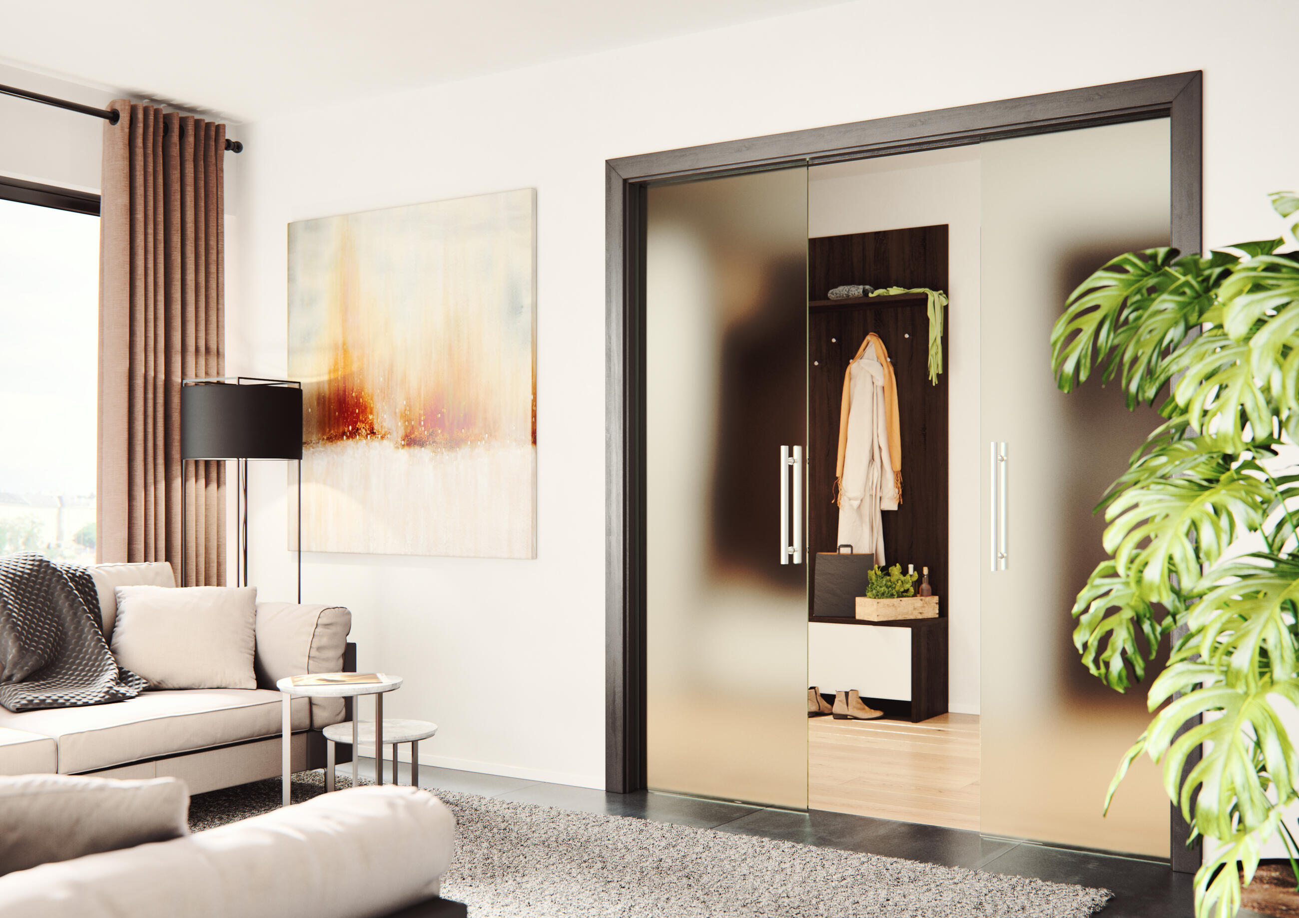 Dvoukřídlé stavební pouzdro pro dvě dveřní křídla se hodí zejména tam, kde požadujete mít velký průchod, například mezi kuchyní a obývacím pokojem. Když je potřeba, dveře se jednoduše zavřou a máte dvě oddělené místnosti. Když chcete prostor zvětšit, dveře "zmizí" ve zdi a nikde nepřekáží.