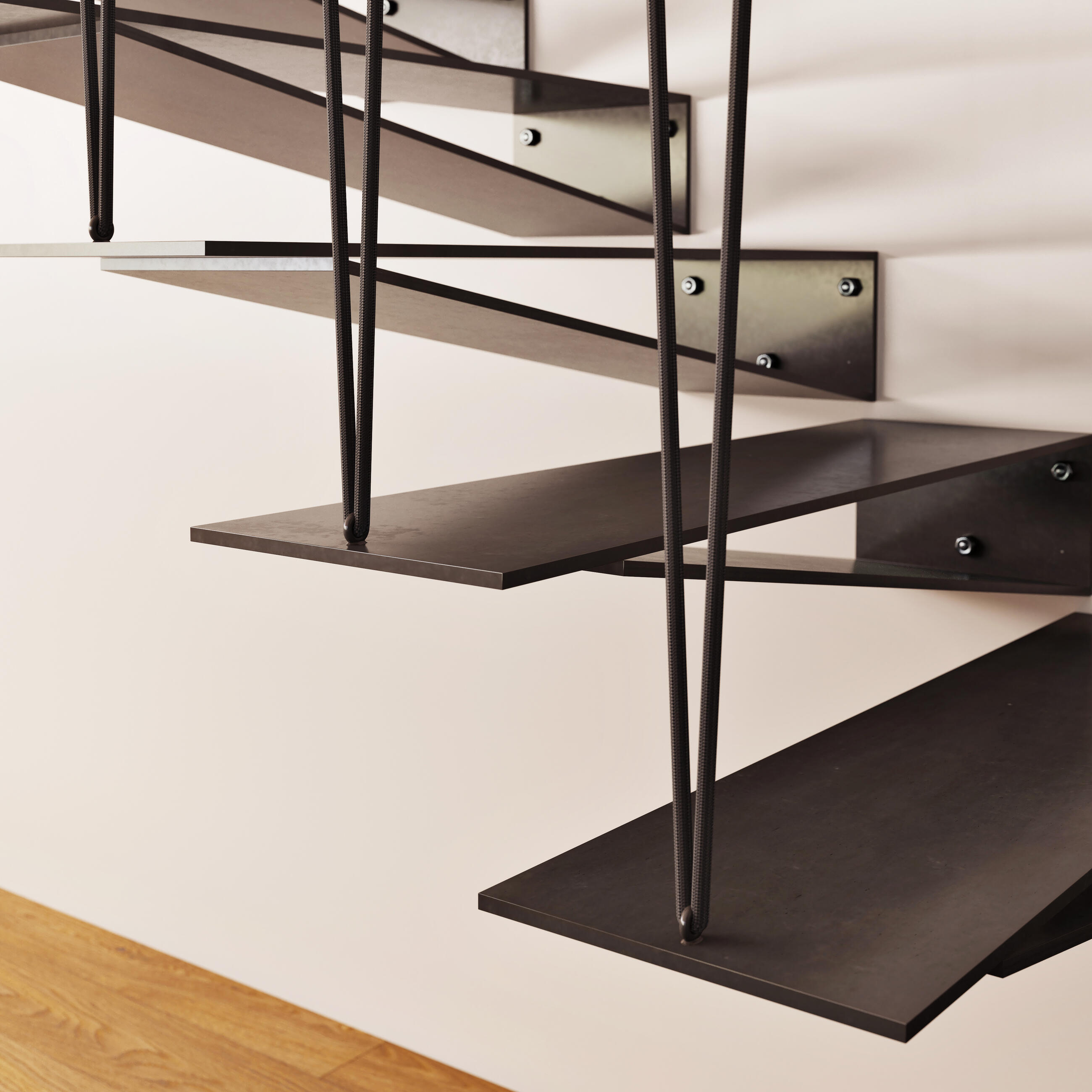 Jednotlivé schody jsou svařeny z 10 mm silných plechových výpalků. Montáž se provádí většinou do hotového interiéru, důležitou podmínkou je kompaktní – nejlépe betonová nosná zeď.