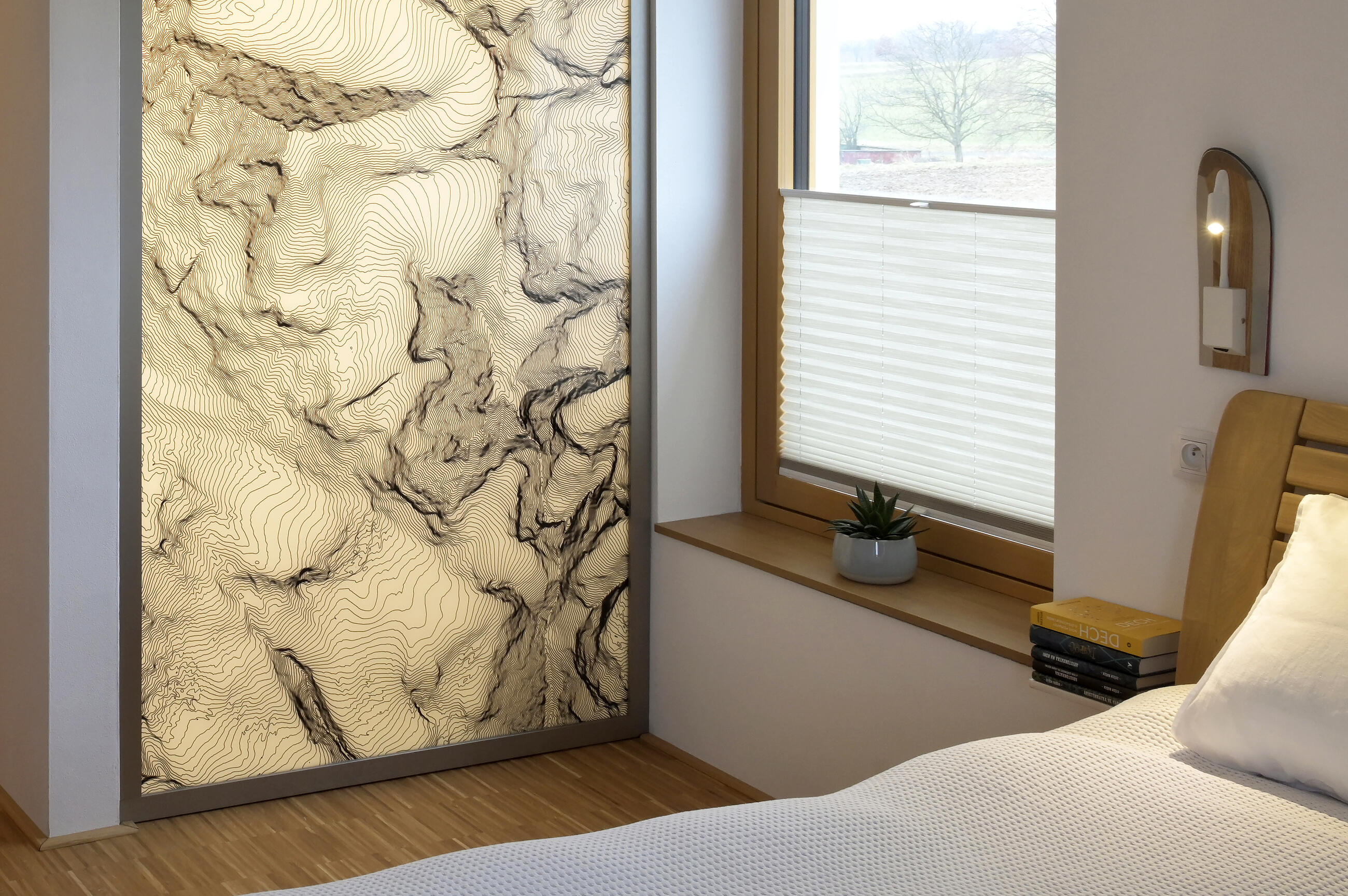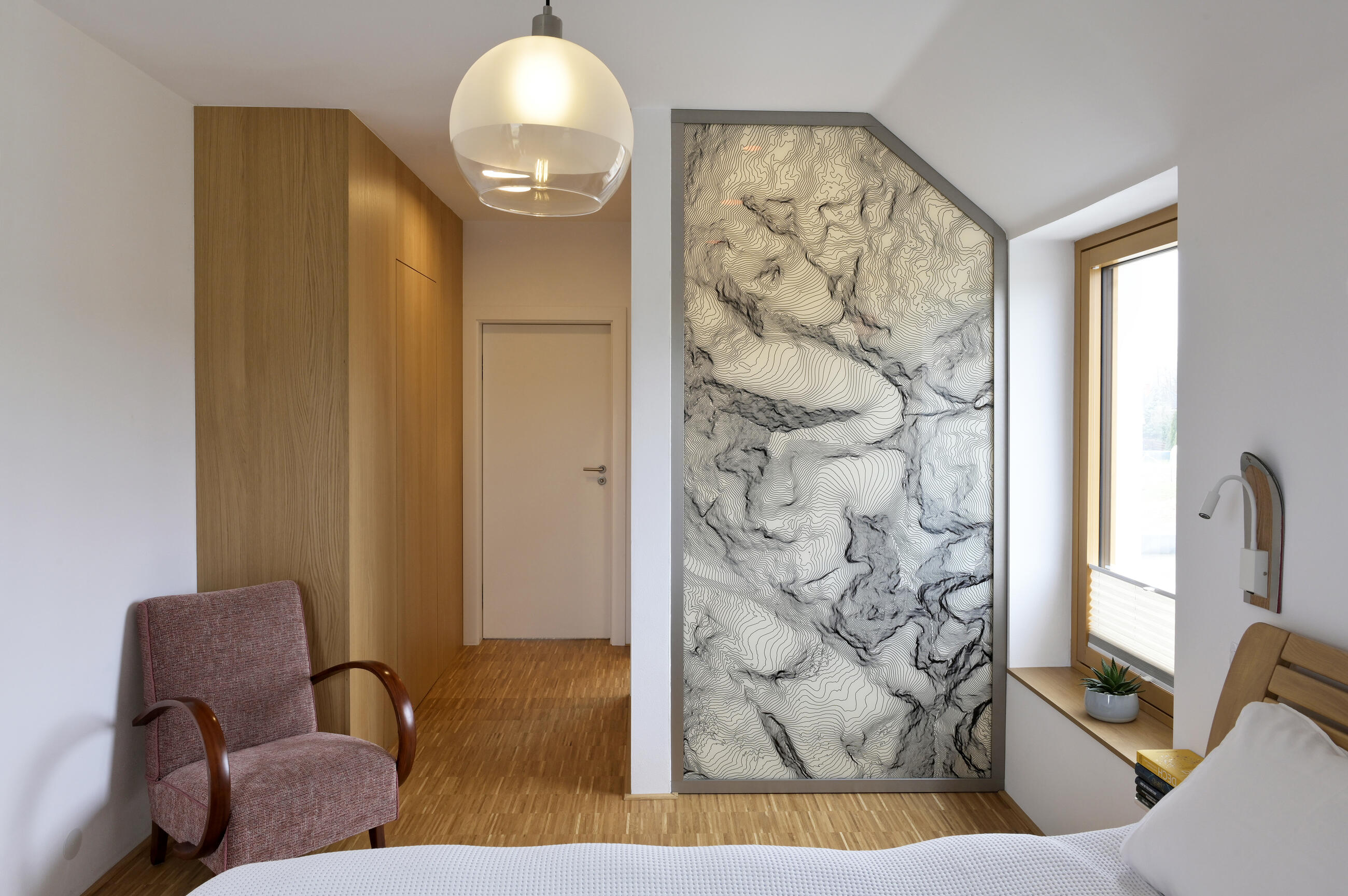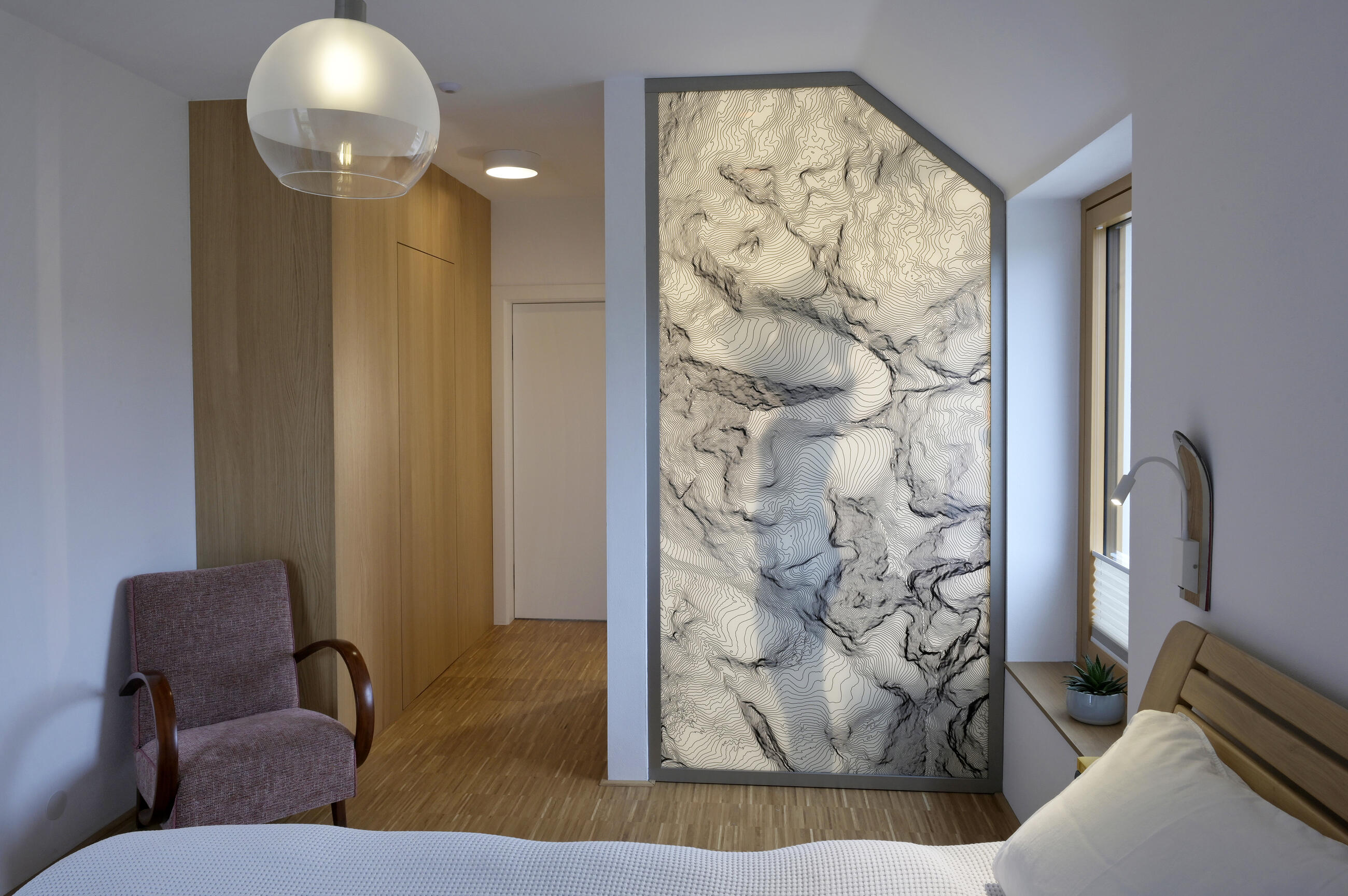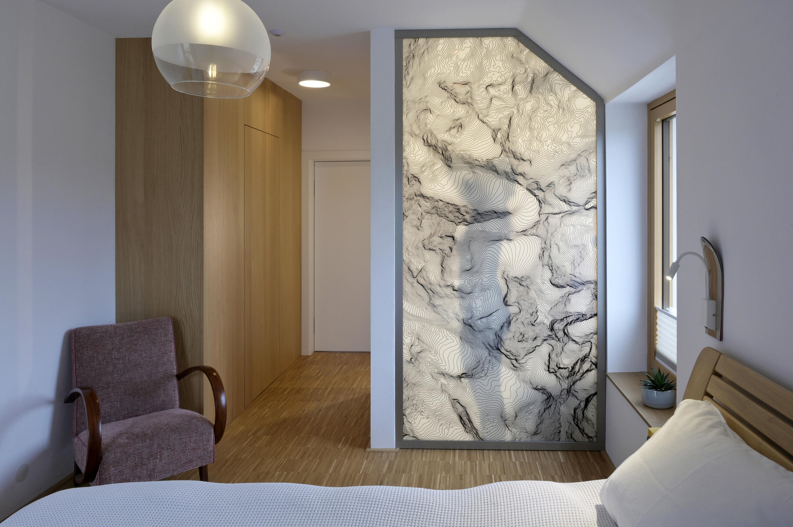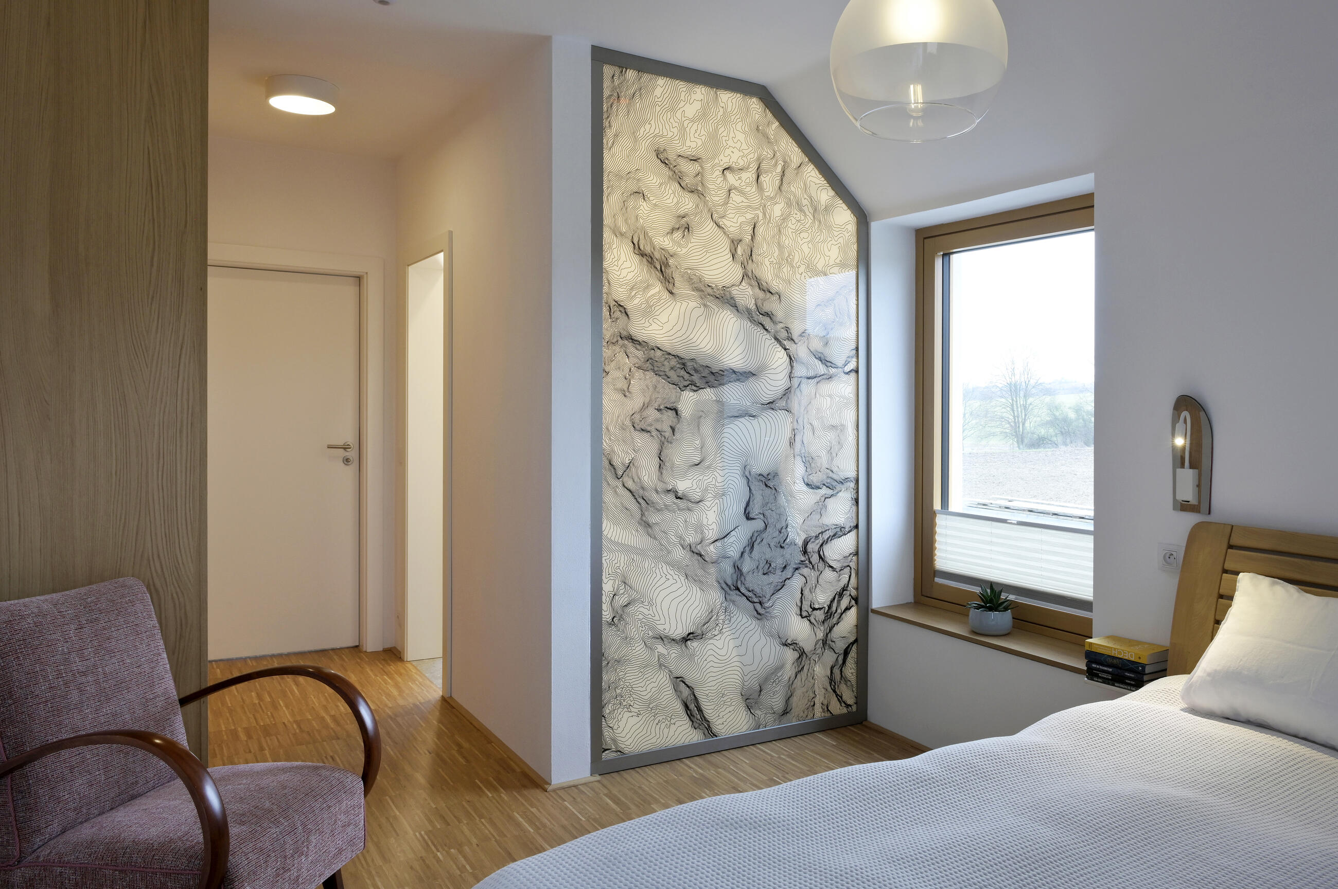 Výsledné provedení včetně montáže bylo realizováno na vysoké úrovni. Skleněná stěna s vrstevnicemi pro nás významného pohoří je perlou interiéru, na kterou se díváme při každém probuzení, usínání i sprchování."