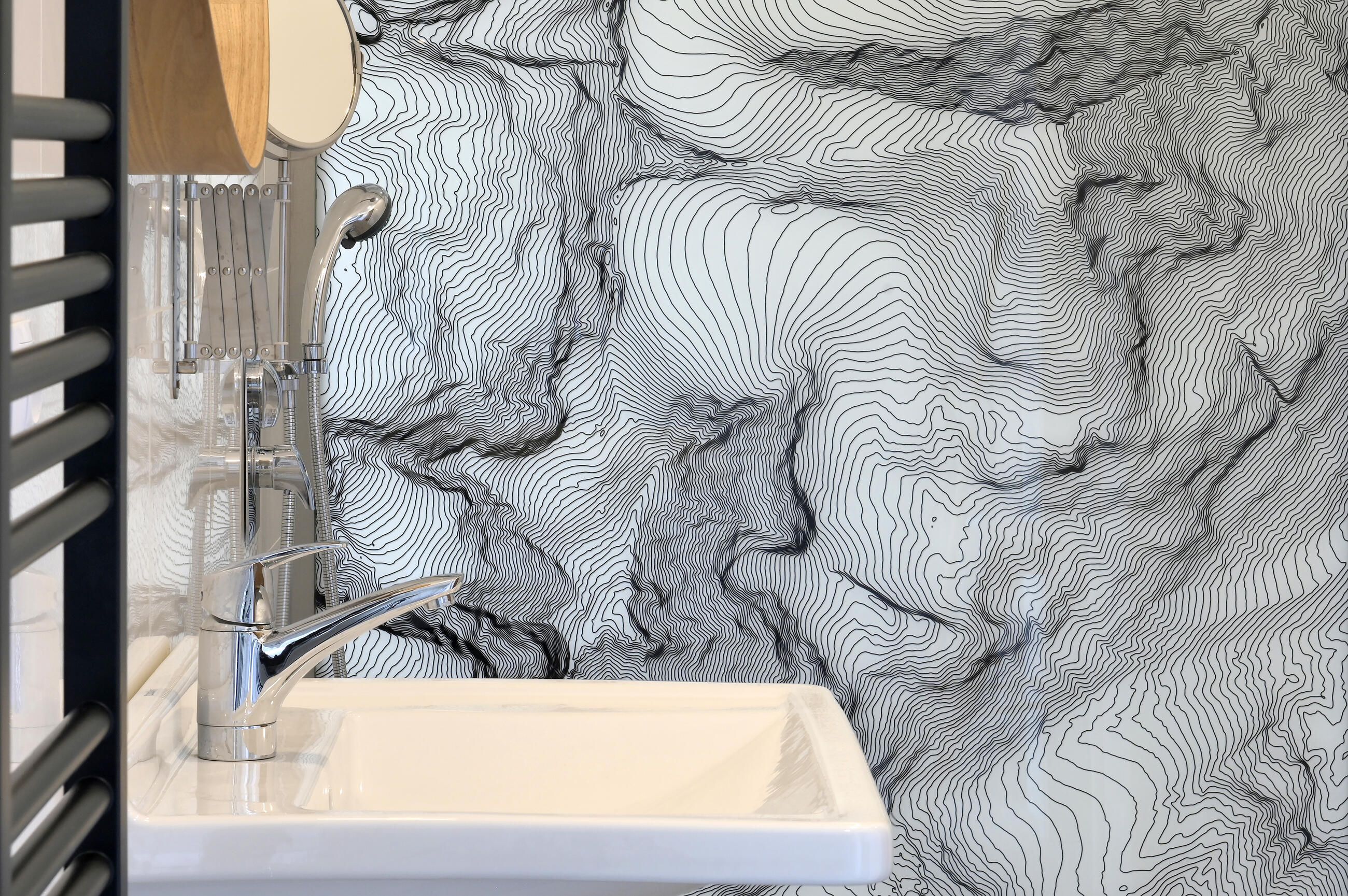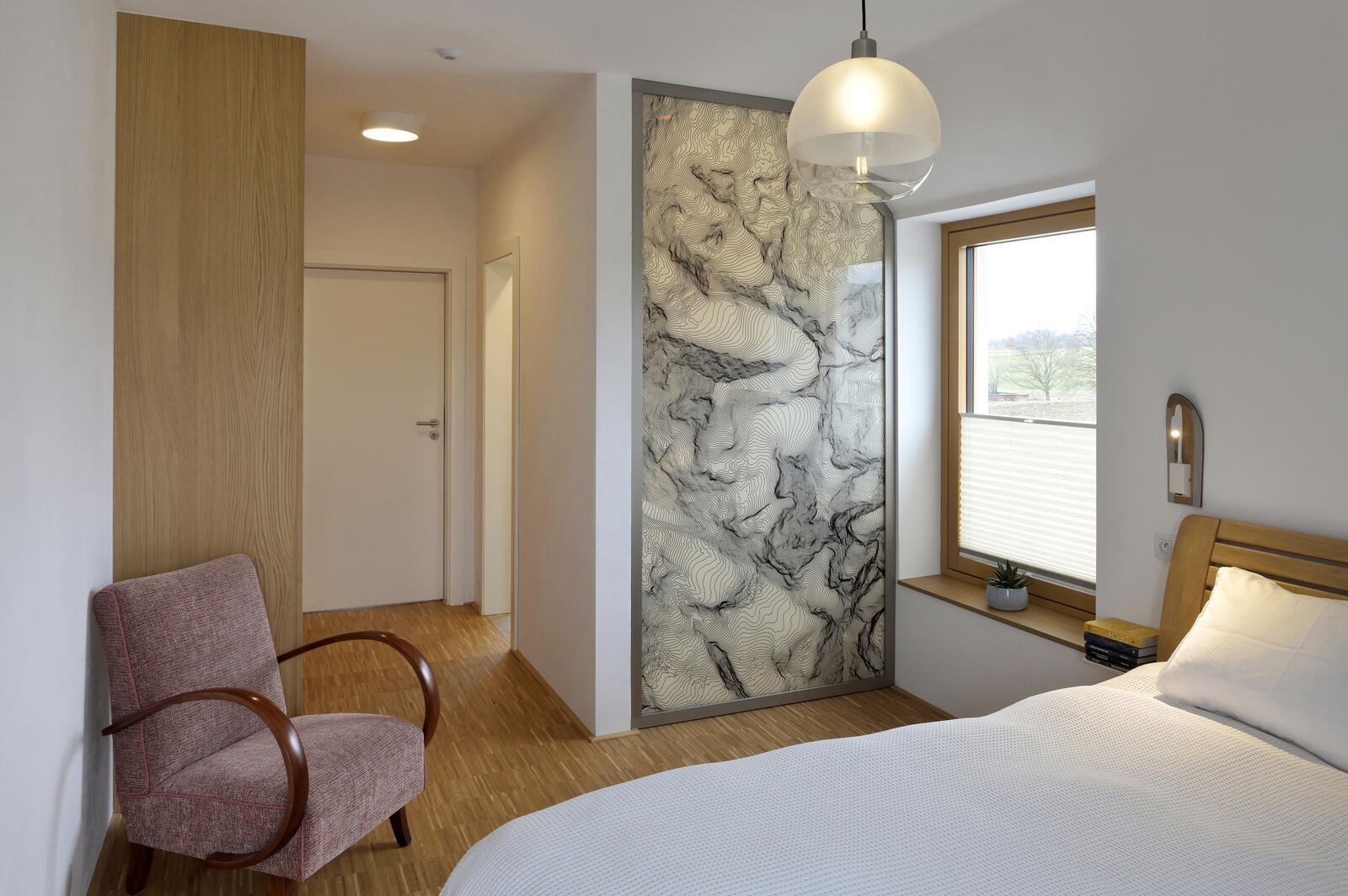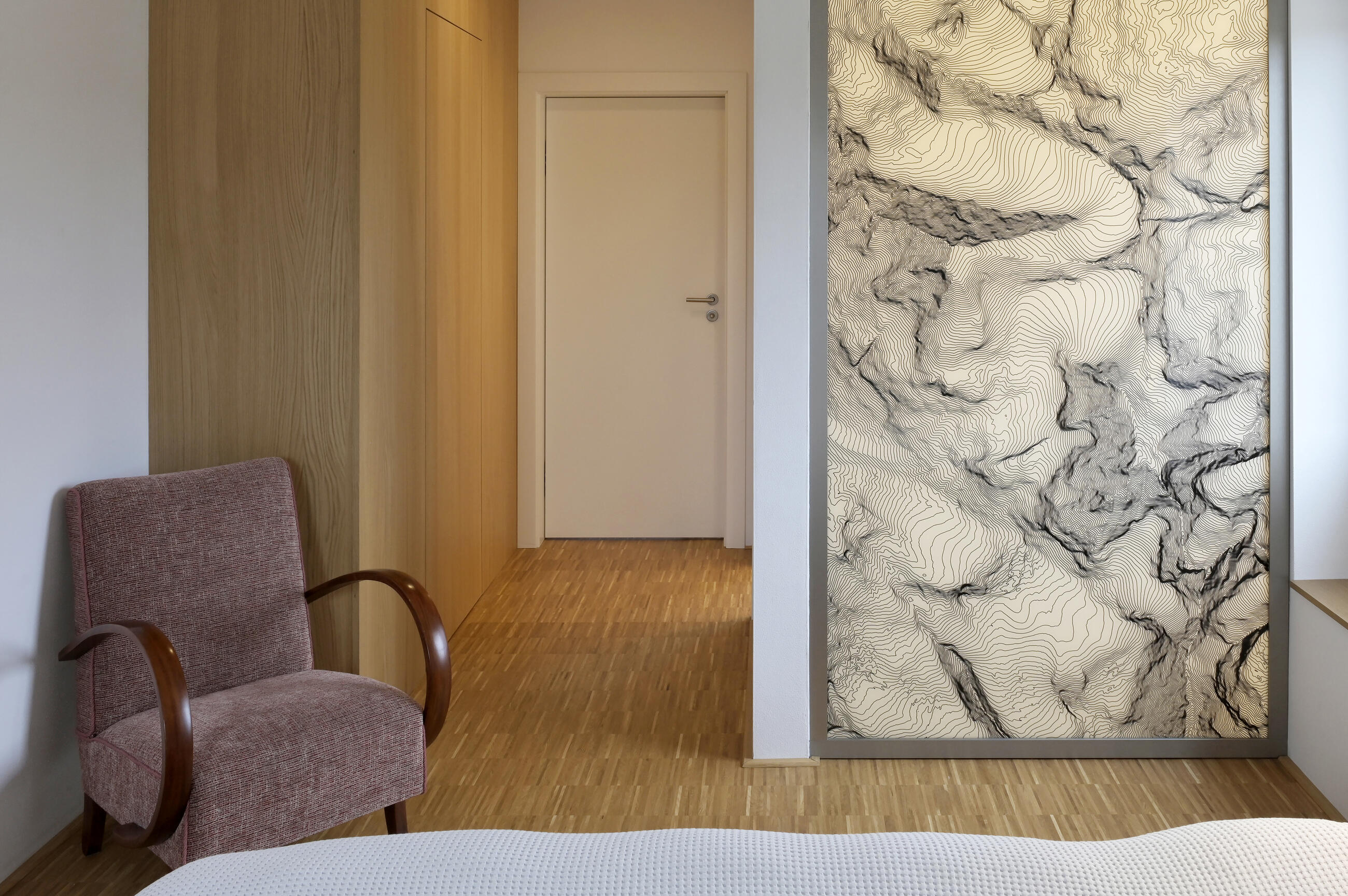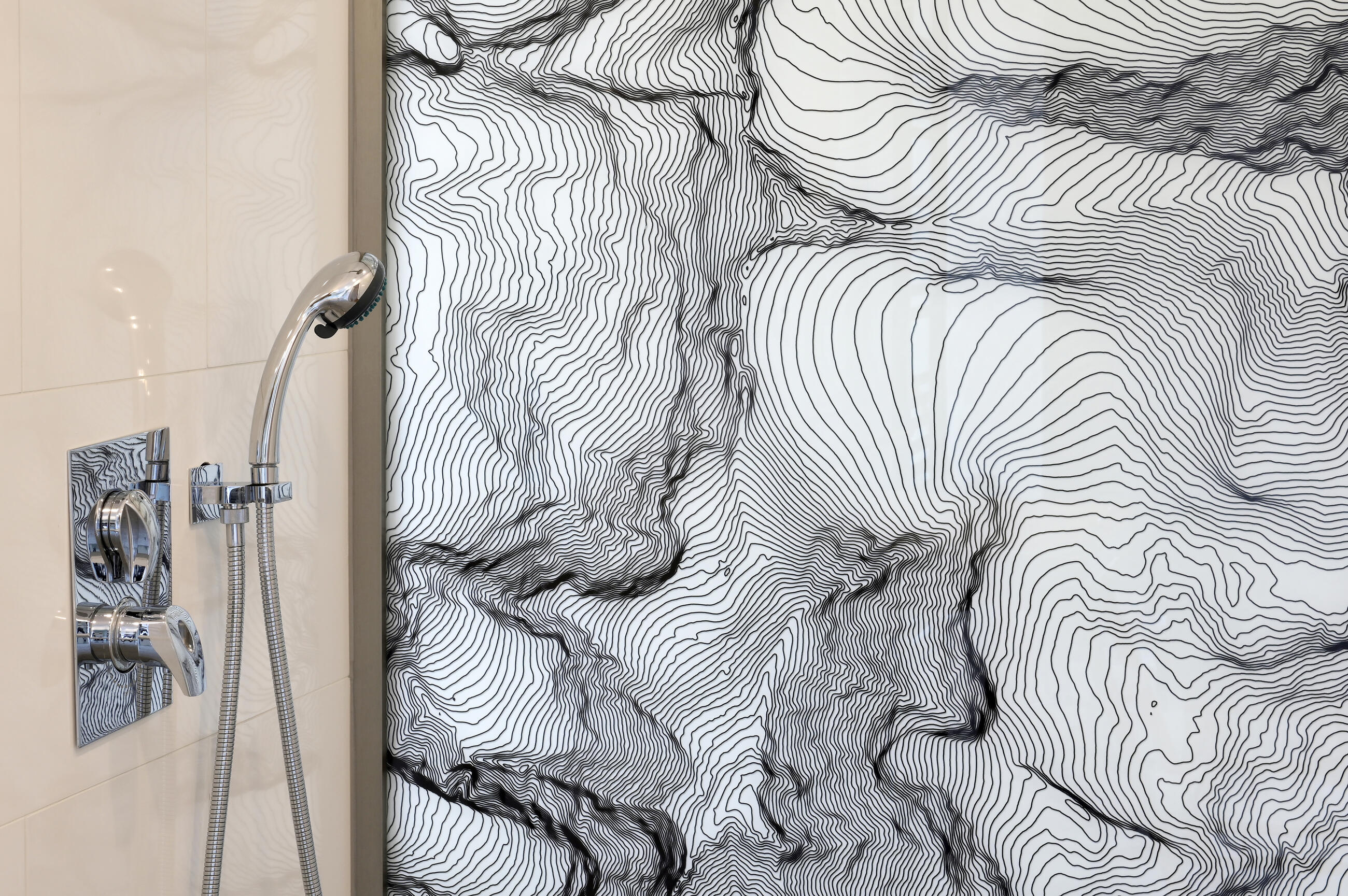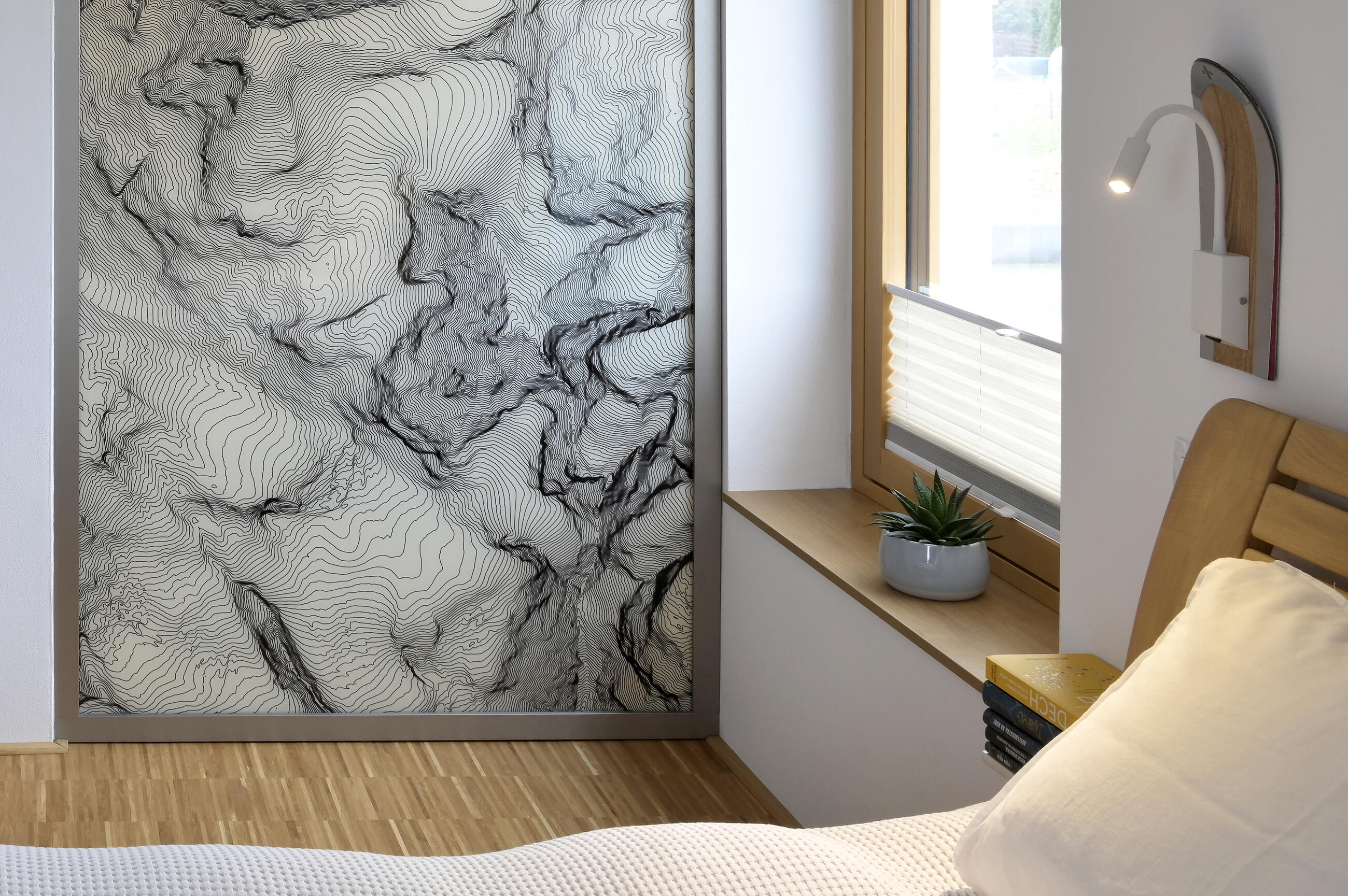 Výsledné provedení včetně montáže bylo realizováno na vysoké úrovni. Skleněná stěna s vrstevnicemi pro nás významného pohoří je perlou interiéru, na kterou se díváme při každém probuzení, usínání i sprchování."