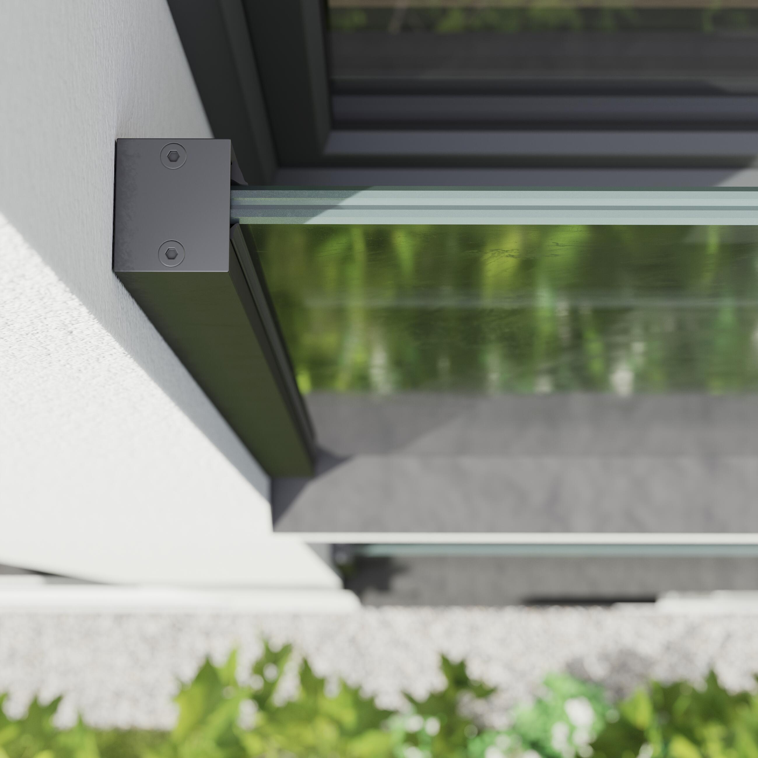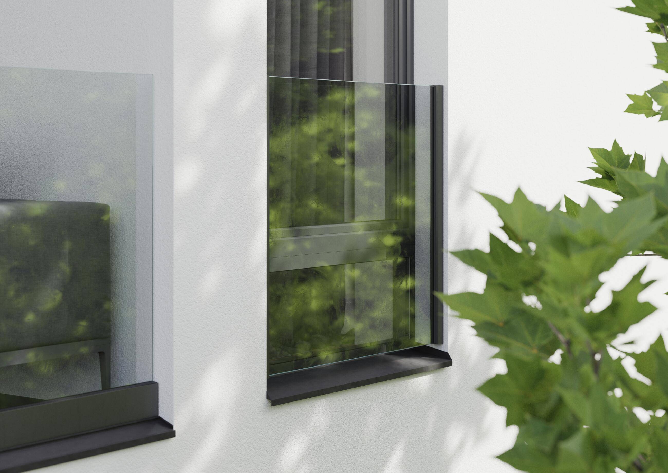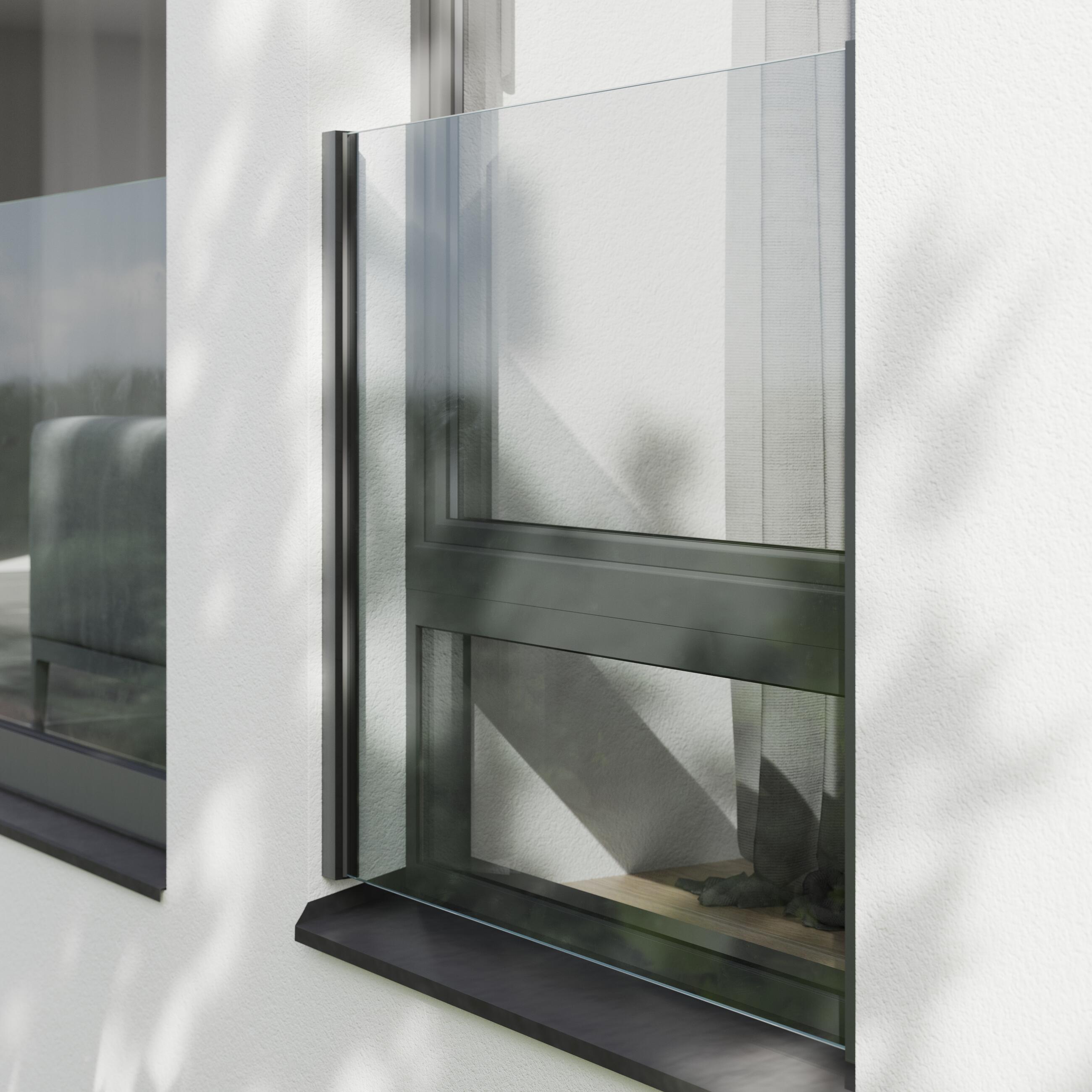 - Na lištu se ze spodní strany namontuje krytka, sloužící jako zarážka proti vysunutí skla. Lištu instalujeme do svislé polohy na kotvící prvky oken, mezi špalety nebo z čela špalety. V případě zateplené fasády je nutné mít nachystanou předmontáž nebo alespoň kotvit na kotevní prvky s přerušeným tepelným mostem. Do namontované lišty se vloží vnější těsnění, nainstaluje se sklo a zasklí zasklívacím těsněním. Nasadí se přední krycí lišta a následně se z horní hrany našroubují horní krytky. Pokud je vhodné doplnit, zábradlí se doplní lištou nebo narážecím madlem