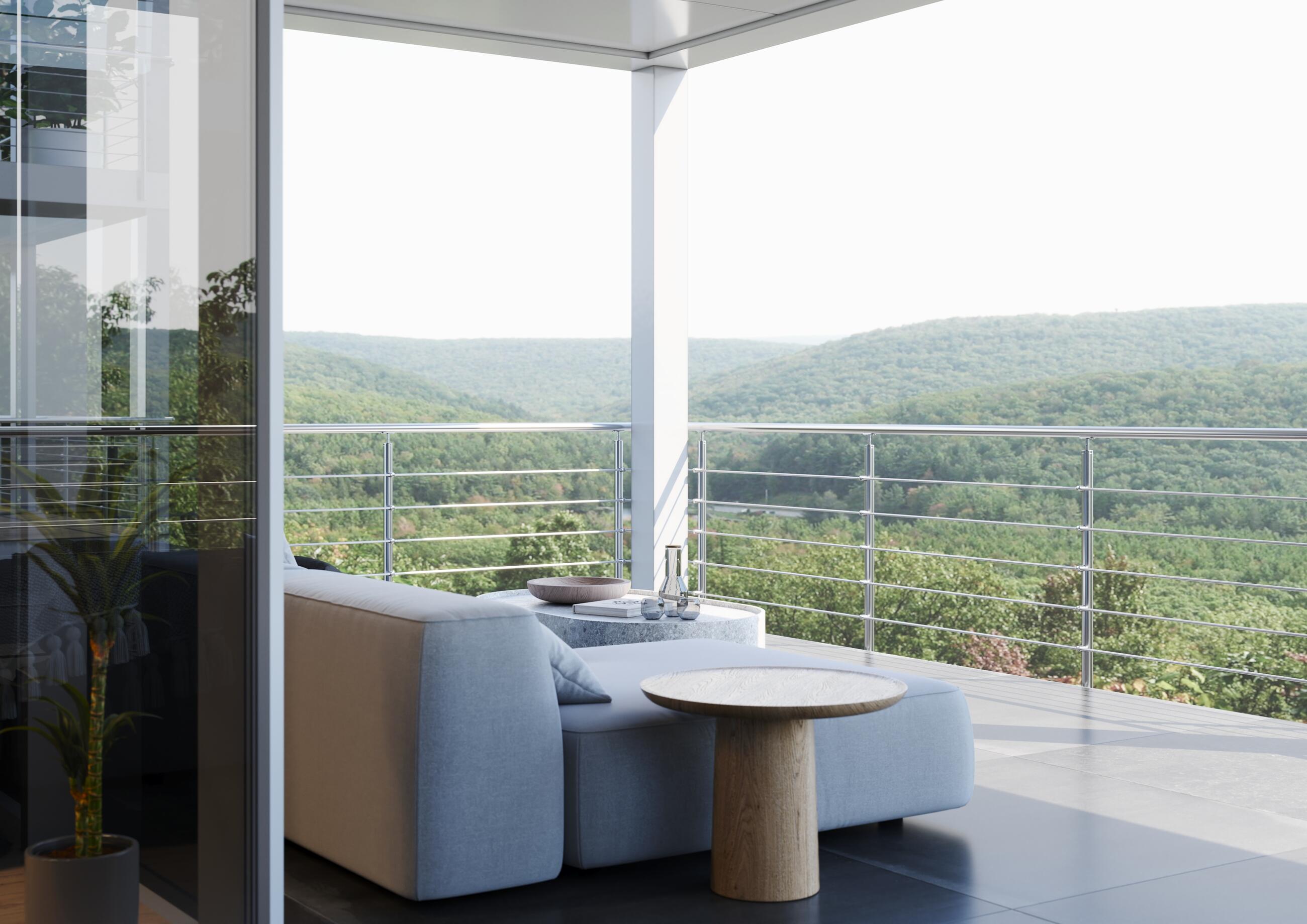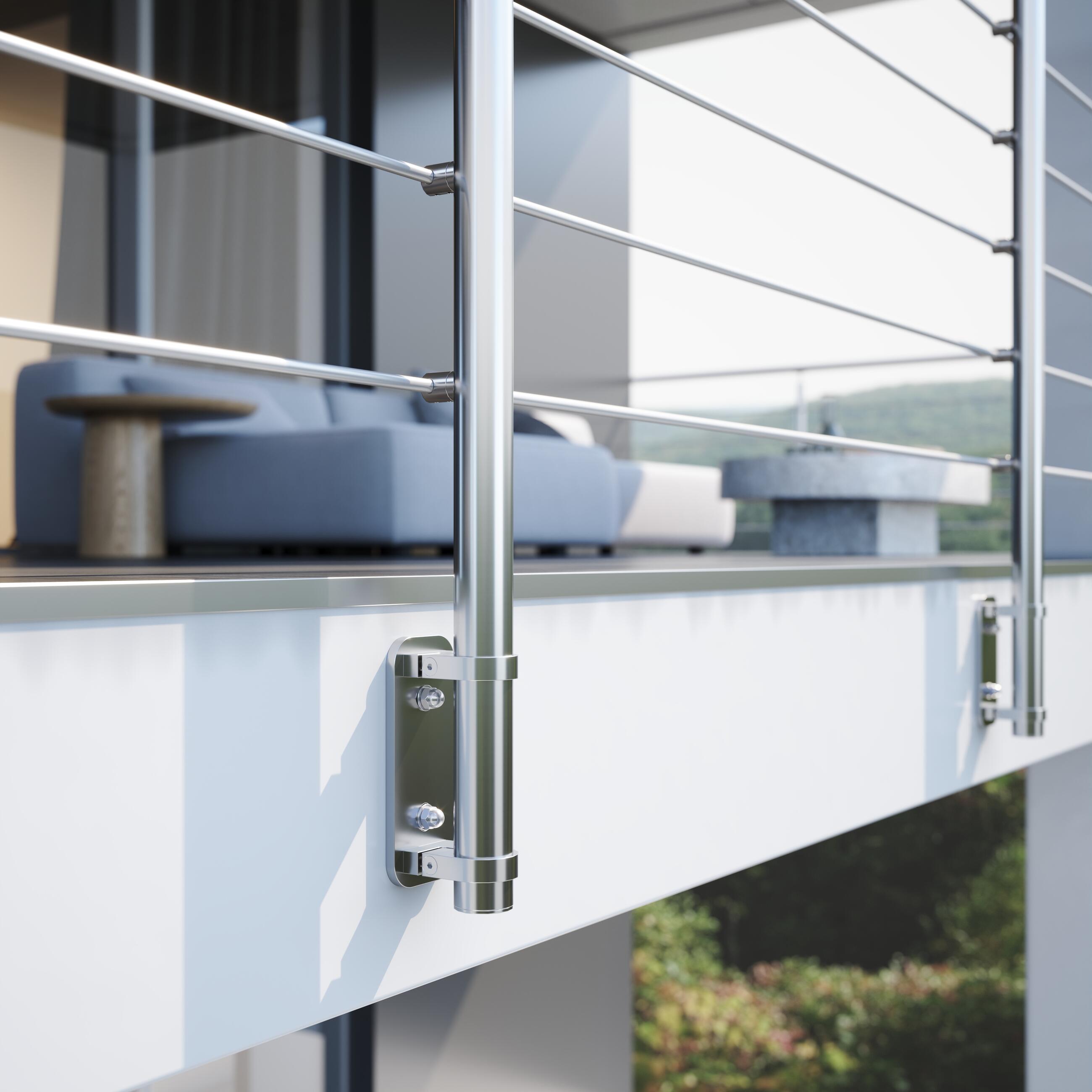 Zábradlí TERASA 2 má základní konstrukci tvořenou sloupky, vodorovnou prutovou výplní a madlem z nerezové oceli. Nerezové patky se kotví z boční strany