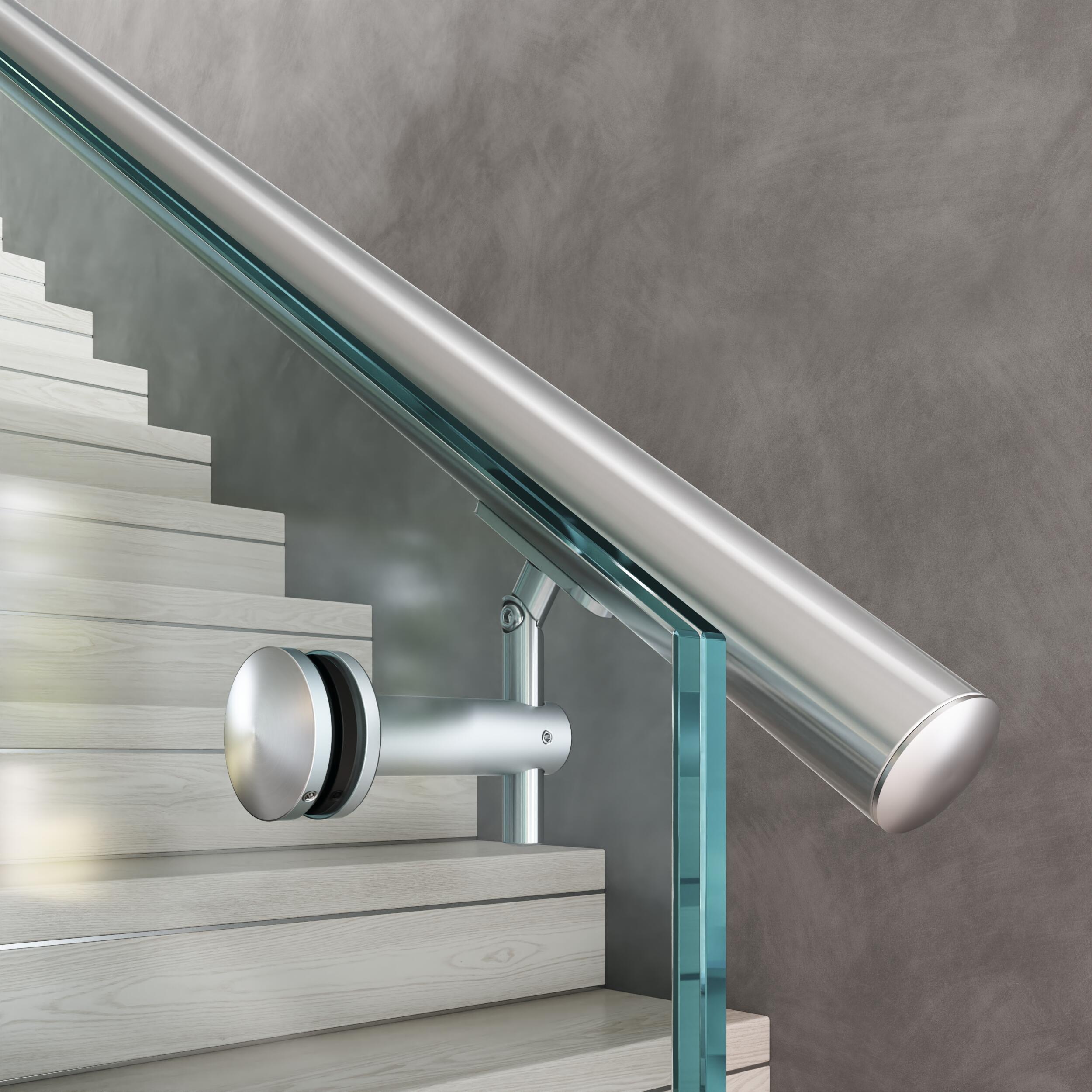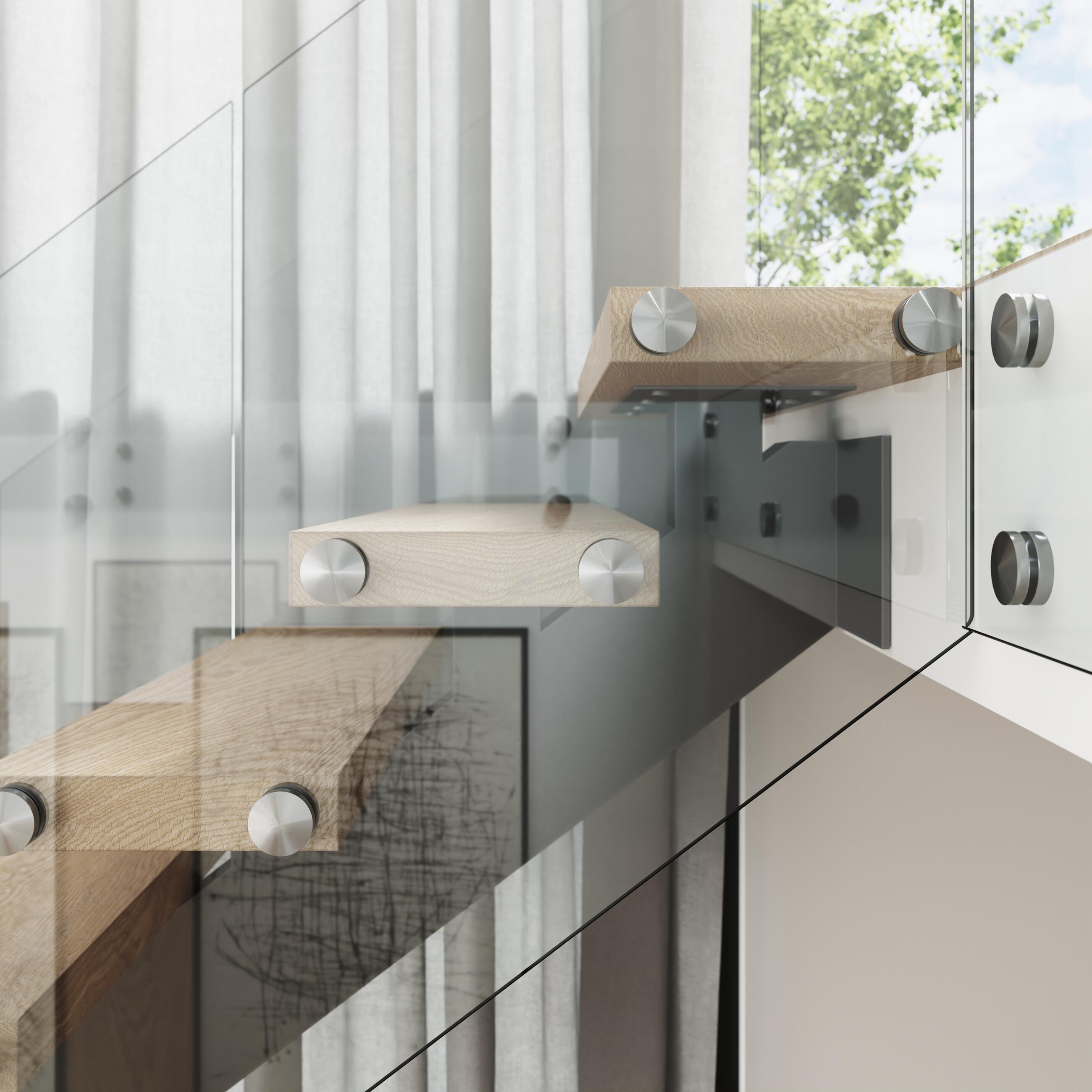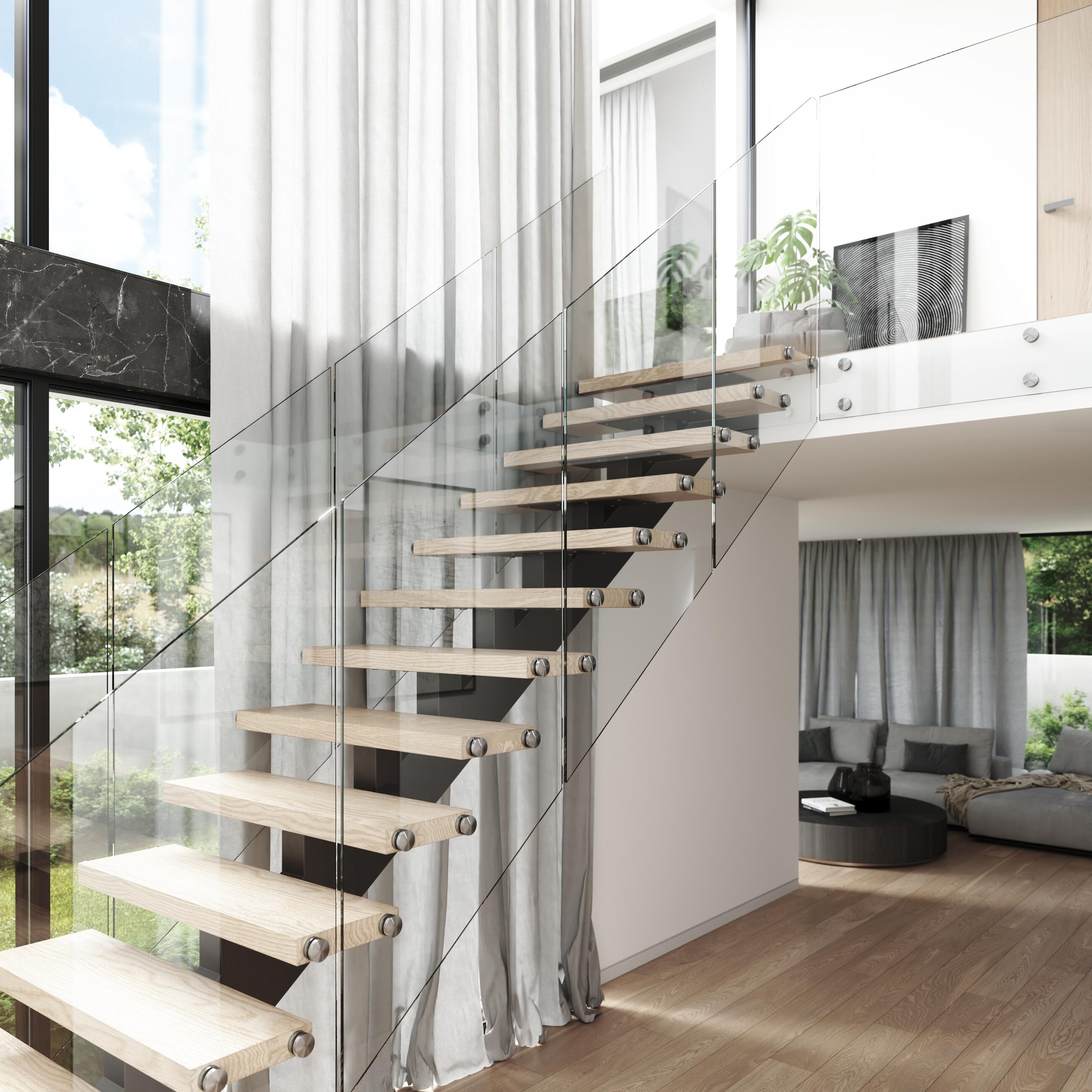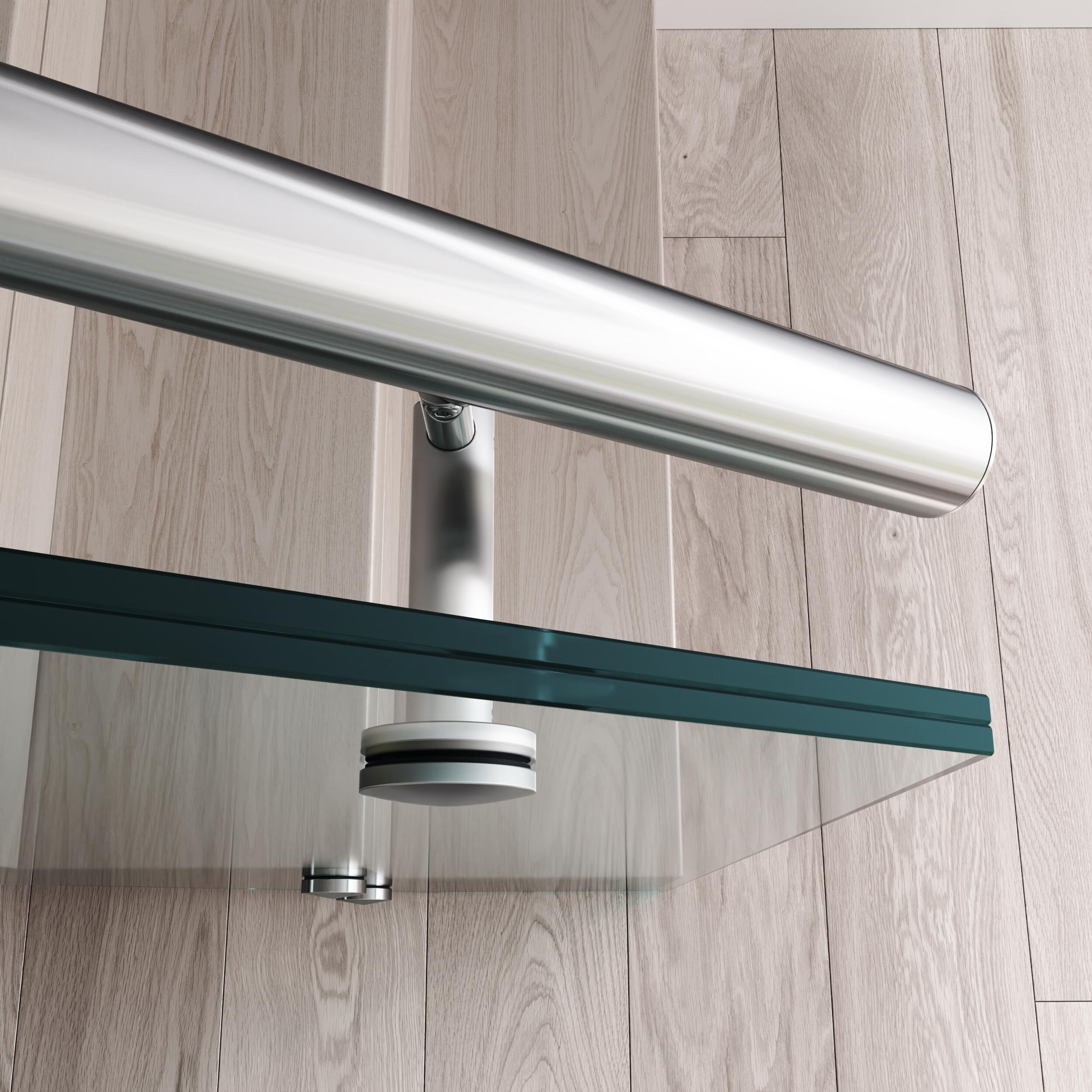 Celoskleněné zábradlí je vhodné doplnit madlem, které může být umístěno shora přímo na skle nebo na vyosených krčcích. Hranu skel je dobré chránit proti poškození krycím „U“ profilem. Madlo, krycí profil a puky u modelu TRANSPARENT vyrábíme i v odstínech RAL dle požadavků zákazníka. Interiérové zábradlí TRANSPARENT má základní konstrukci tvořenou dvojicí lepených kalených skel kotvených z boku schodiště na tzv. nerezové puky.